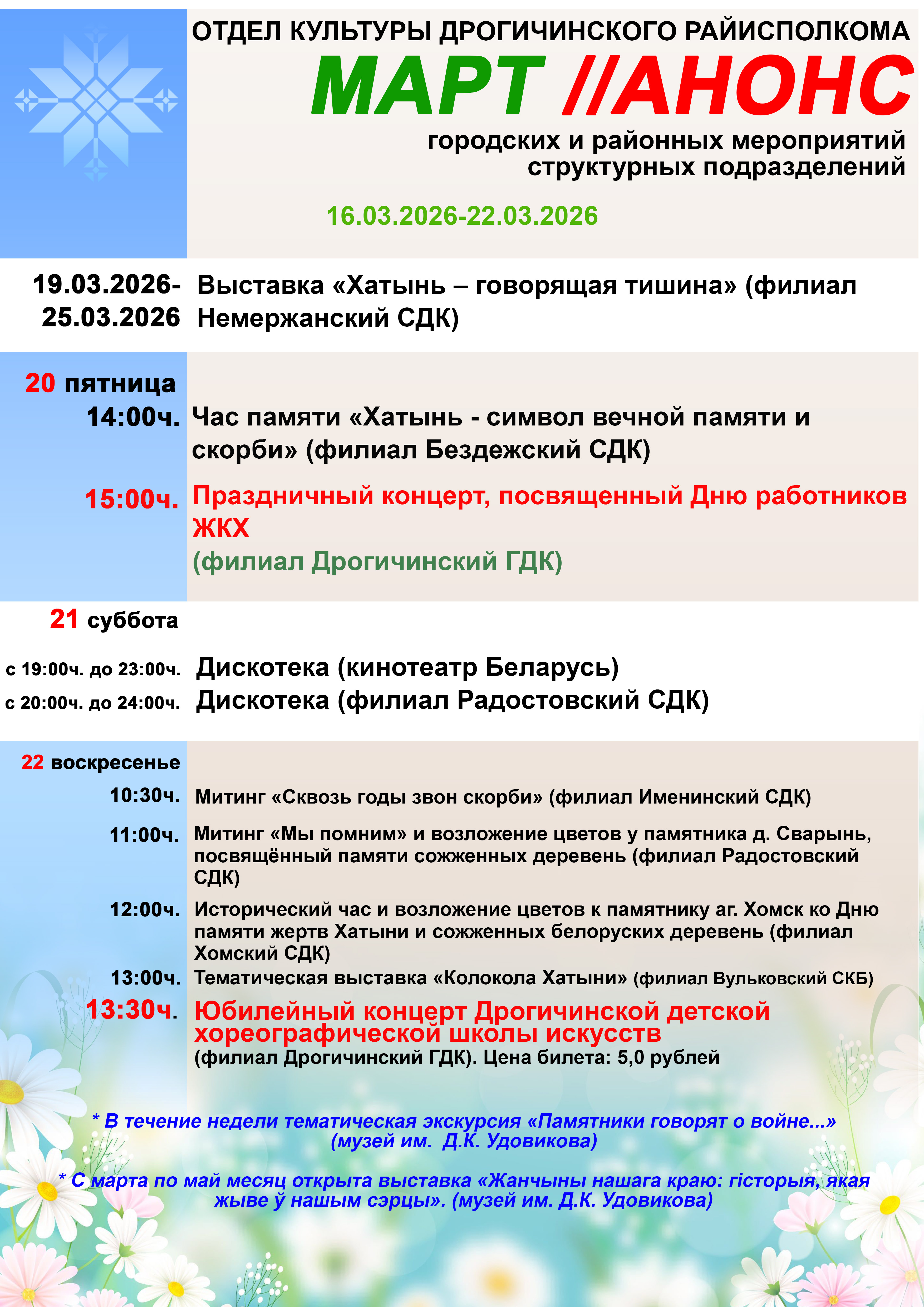Анонс мероприятий городских и районных мероприятий структурных подразделений с 16.03.2026-22.03.2026